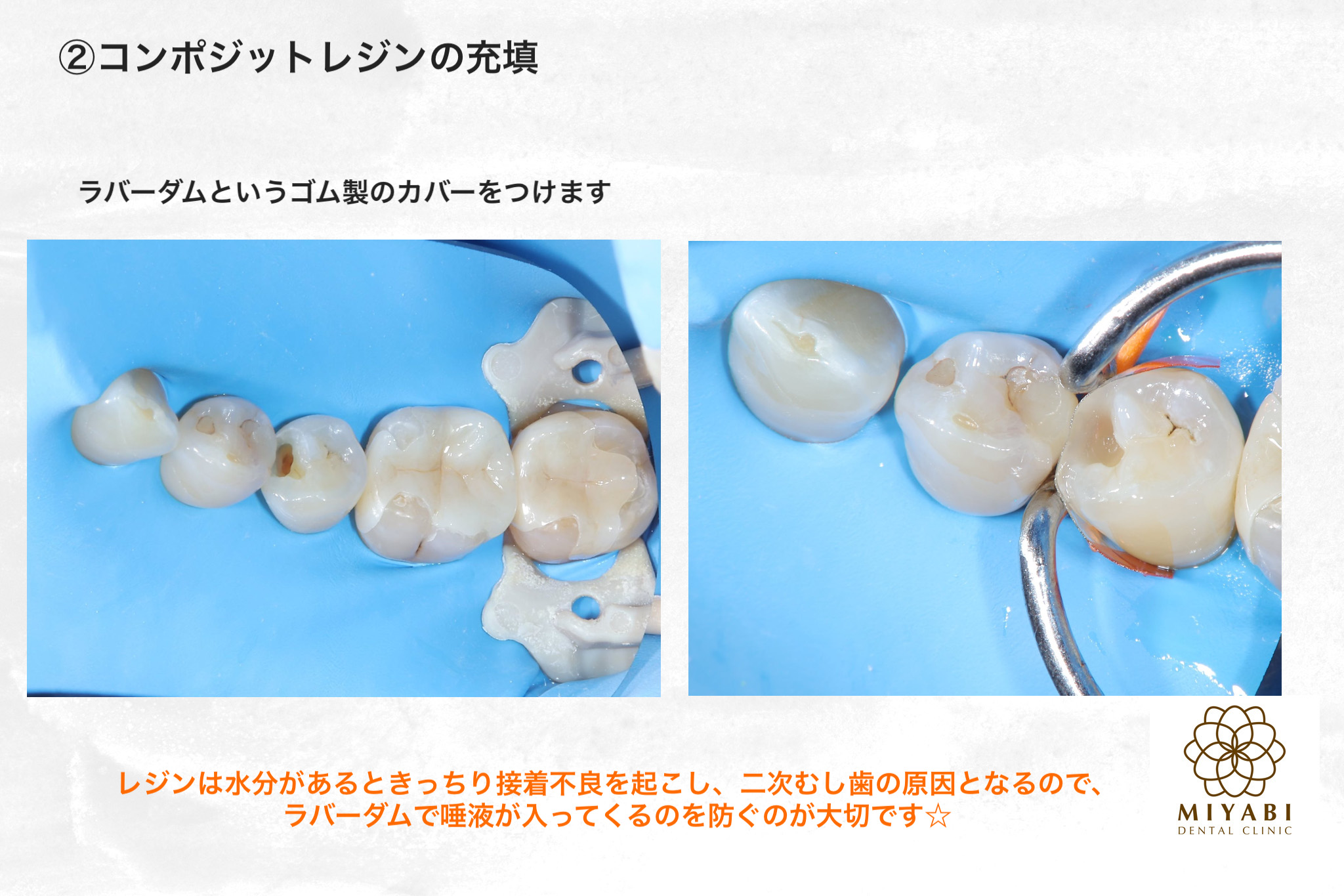 <治療の提案>型取りをして詰め物を入れる方法(間接法)だと歯を削る量が増えてしまうので、極力必要最低限に歯を削って口腔内で直接詰め物を行なっていく方法(直接法)を提案いたしました。